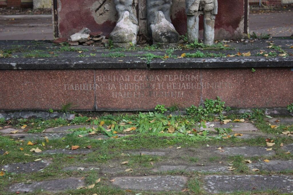 „вечная слава героям павшим в боях за свободы и независимость нашей социалистический родины“ (Russisch: „Ewiger Ruhm für die Helden, die in den Kämpfen um Freiheit und Unabhängigkeit unserer sozialistischen Heimat gefallen sind“) steht dort mit goldenen Lettern auf einer polierten Natursteinplatte geschrieben, welche wiederum in das Zentrum eines angedeuteten Tryptichons eingefasst ist.