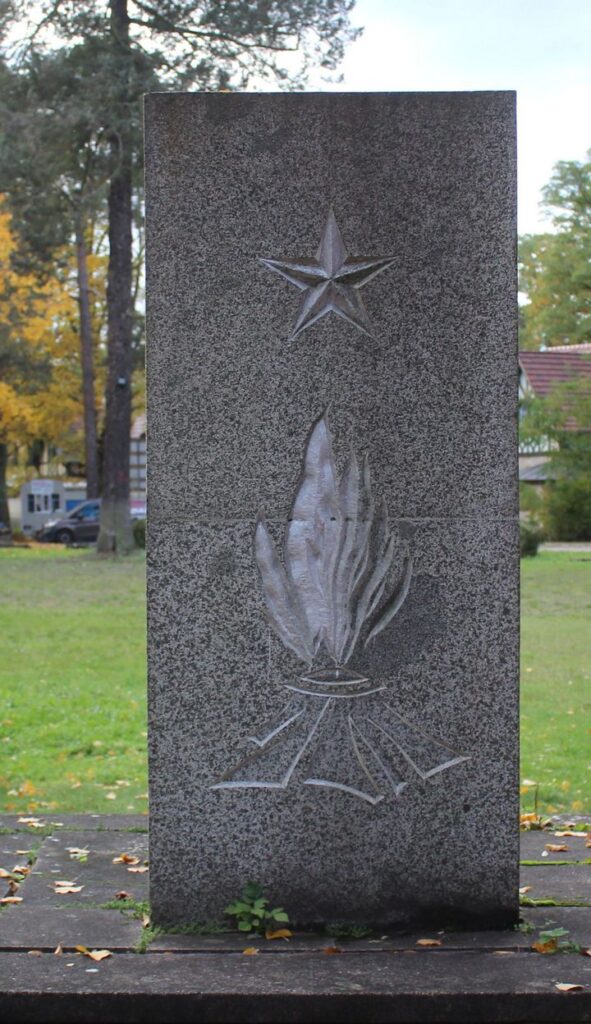 Das über eine mehrstufige Treppe erreichbare und mit einem roten Stern gekrönte massive Denkmal erinnert an Soldaten der Roten Armee, welche in den letzten Tagen des Zweiten Weltkrieges in der Umgebung von Grünheide gefallen sind.”